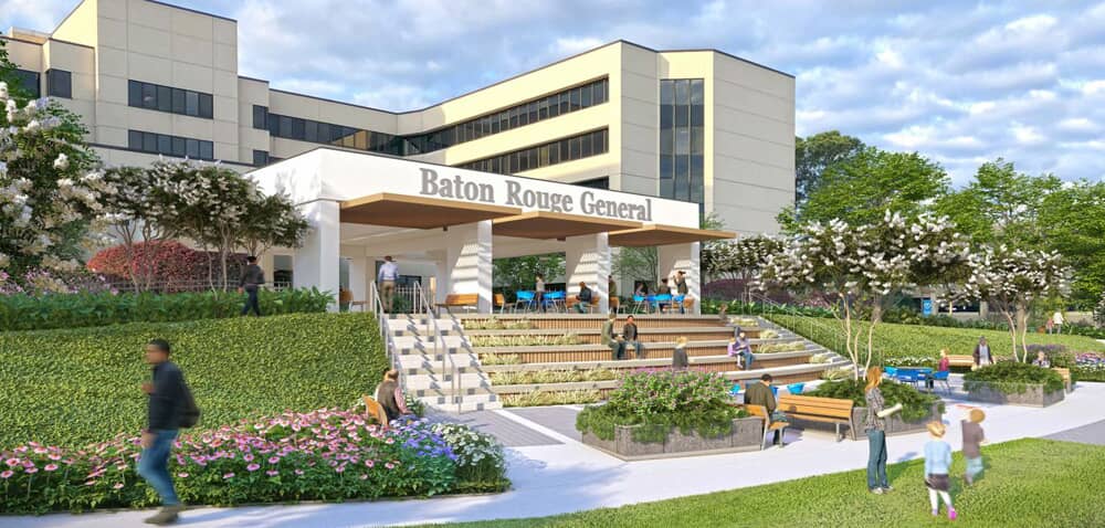 Plans for a new front entrance of the hospital will add green space and make the hospital even more a part of the community. Our vision includes removing the fence and staff parking lot facing Florida Boulevard, and opening up a large park-like space with a plaza and seating. The new area could also host future events like our Pop-up Pink Pumpkin Patch, screening events and Holiday Lights display, as well as other community-driven events in Mid City.
