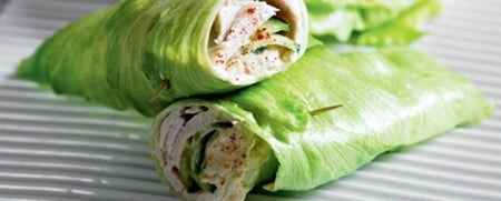 Cook the chicken breasts and cut into strips. Evenly spread the lettuce leaves with mustard. Lay vegetables along the center, then top with chicken. Fold and roll tightly.