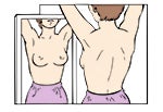 While standing in front of a mirror with your hands pressing firmly down on your hips, look at your breasts for any changes of size, shape, contour, dimpling, redness or scaliness of the nipple or breast skin.